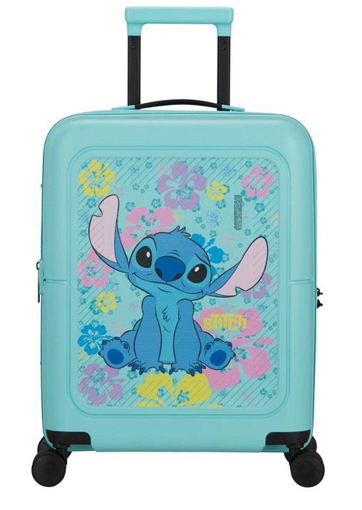 Mala Spinner de 4 rodas na cor Stitch Flower, fabricada em 100% polipropileno para máxima resistência e durabilidade. Compacta e leve, é de tamanho cabine, com dimensões de 55×40×20 cm, extensíveis até 55×40×23 cm, e um volume de 41 a 47 litros.